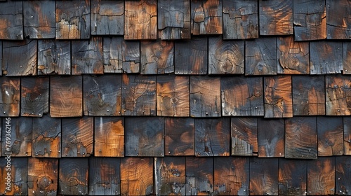 Textured Pattern of Weathered Wood Shingles A detailed view of weathered wood shingles displaying a rich tapestry of texture, patterns, and time-worn colors.