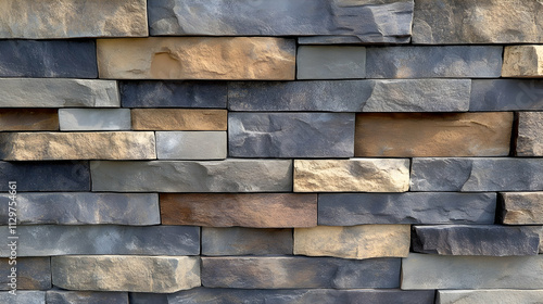 Textured stone wall with varying shades of gray, brown, and beige rectangular blocks.