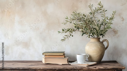 Textured vase with olive tree branches, cup of coffee. Books on wooden table
