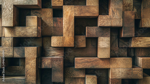Textured wooden blocks create an intricate pattern, evoking sense of warmth and craftsmanship. arrangement showcases various shades of brown, highlighting natural beauty of wood.