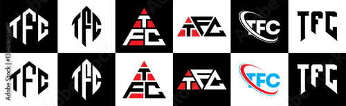 TFC letter logo design in six style. TFC polygon, circle, triangle, hexagon, flat and simple style with black and white color variation letter logo set in one artboard. TFC minimalist and classic logo