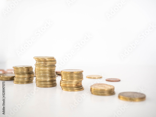 Thai Baht Coins colors Gold set in the mountains,Is the currency of Thailand.For business expenses,Coin is in a jar of money saving,White background