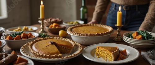 Thanksgiving Feast: A rustic autumnal table laden with a delectable pumpkin pie, sweet potatoes, and other seasonal delights, creating a warm and inviting atmosphere for a family gathering.