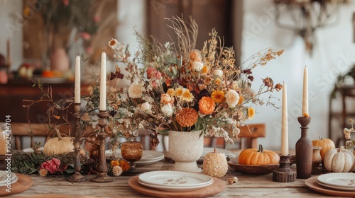 Thanksgiving in a bohemian style, with earthy tones, dried flowers, and a rustic atmosphere