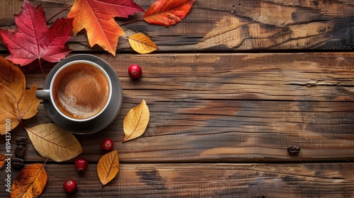 Thanksgiving themed coffee selection with autumn leaves on wooden surface