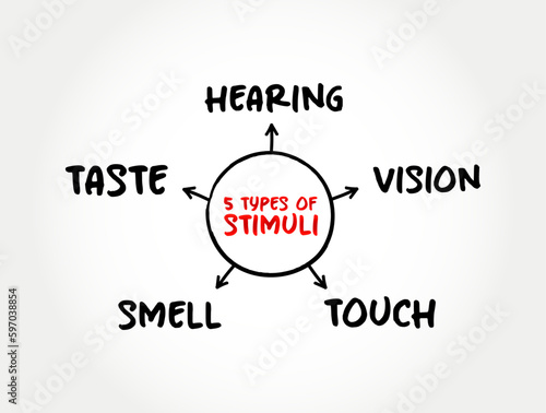 The 5 types of external stimuli - divided into our senses: touch, vision, smell and taste, mind map concept for presentations and reports