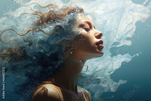 The abstract image of a woman is mixed with the image of the ocean. Unity with nature, peace and tranquility. Double exposure
