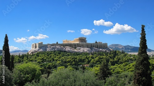 The Acropolis in Athens, Greece, with the Parthenon towering against a bright blue sky.