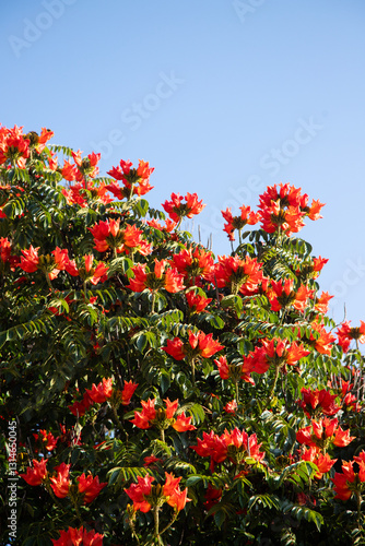 The African tulip tree (Spathodea campanulata). Colorful flowers in the Oaxaca region of Mexico.