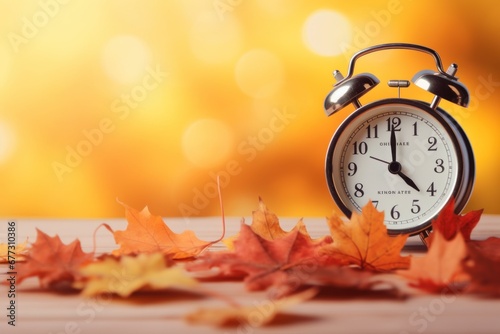 the alarm clock is on a table with orange leaves on an orange background. autumn time