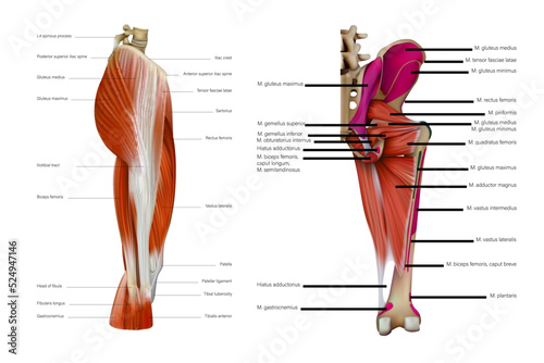 The anatomy of a group of muscles of the human thigh, their structure on a white background. Vector 3D illustration