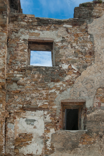 The ancient cobblestone wall with windows close-up. Background of natural stone.