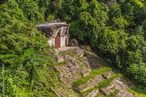 The ancient pyramids of Palenque in Mexico, surrounded by lush jungle. Iconic archaeological site showcasing Mayan culture and history. Travel, history, and adventure concept