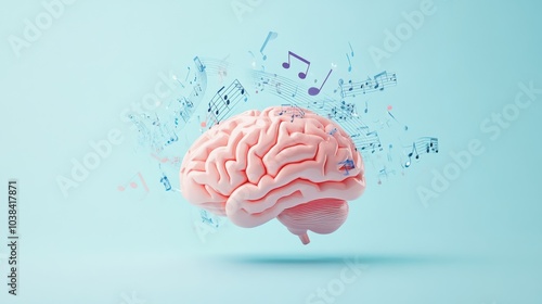 The artwork depicts a human brain immersed in swirling musical notes, highlighting the connection between music and cognitive processes. Generative AI