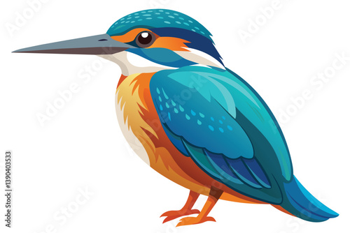 The artwork shows a colorful kingfisher bird in profile, with blue and orange plumage, against a white background. Its wings are folded.