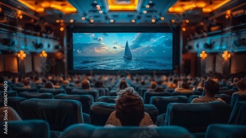 The audience sits in plush seating, captivated by a stunning view of a sailboat gliding across the tranquil sea as twilight descends, creating a magical atmosphere