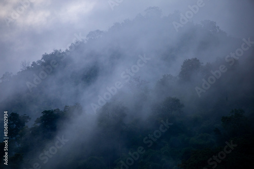 The background texture of mountains in the rainy season and the icy rain fog feels cool and refreshing with the green color of the forest that is cool and pleasing to the eye.