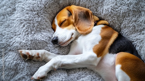 The beagle dog sleeps on a soft plush dog bed Top view : Generative AI