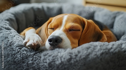 The beagle dog sleeps on a soft plush dog bed Top view : Generative AI