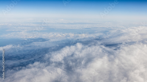 The beautiful cloudscape with clear blue sky. A view from airplane window.