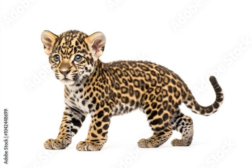 the beside view baby East African Jaguar standing, left side view, low angle, white copy space on right, Isolated on White Background