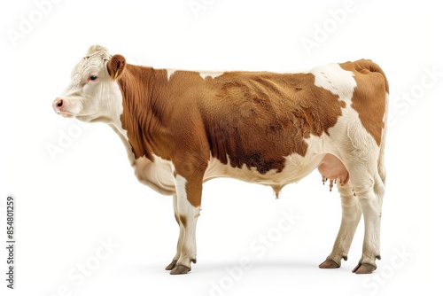 the beside view Simmental Cow standing, left side view, white copy space on right isolated on white background