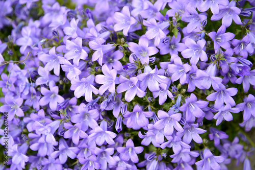 The blossoming hand bell (Campanula cochlearifolia). Background