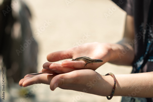 The boy holds a lizard in his hands. Close-up. Surrounding nature