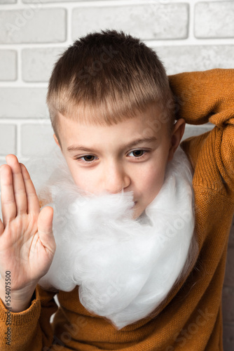 The boy in the yellow sweater grimaces as he tries on Santa's beard. Front view
