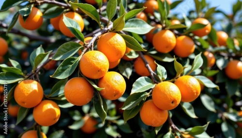 The branches of the orange tree are weighed down by plump, ripe citrus fruit, their vibrant colors catching the sunlight and creating a beautiful display of nature's bounty.