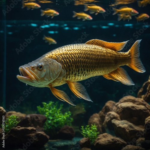 The Brown trout (Salmo trutta fario) in the aquarium Golden fish swims in aquarium tank The Brown trout (Salmo trutta fario) in the aquarium