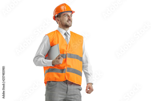 The builder in a construction vest and an orange helmet with tablet. Safety specialist, engineer, industry, architecture, manager, occupation, businessman, job concept