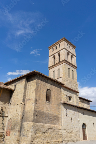 The building has many arched windows and a stone facade. Sunny day at the church of Bartolome. Spain