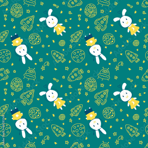 The bunny as an astronaut in space doodle seamless pattern. Perfect print for T-shirt, textile, fabric. Hand drawn illustration for decor and design.
