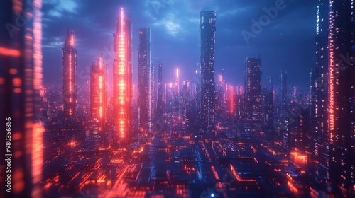 The bustling cyberpunk metropolis comes alive at night, featuring illuminated skyscrapers and a network of technology that reflects the energy of a high-tech future.