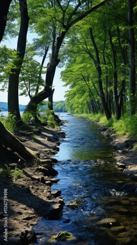 The calm river flows gently, bordered by vibrant green trees and a sandy bank