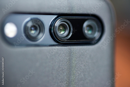 The camera on cell phone. Smartphone camera close-up. Close up of a mobile phone camera, flash and sensors