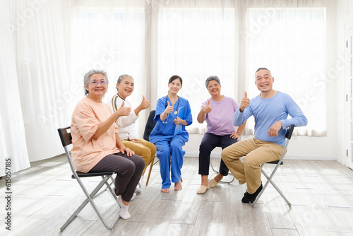 The caregiver therapist sits with a group of Asian senior people with thumbs up in a circle for checking physical and mental health in a group elderly therapy session. The nursing home facilitates