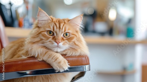 The cat is sitting in a barber's chair, as if waiting for a haircut .