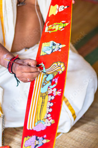 The Ceremonial bow, Onavillu. Artisan painting god's pictures on bow. It is made for annual rituals at Padmanabha swamy temple during Onam festival season.