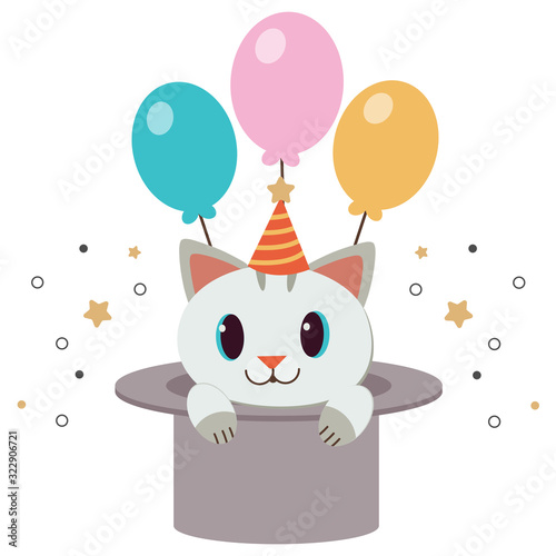 The character of cute cat sitting in the top hat with balloon and star on the white background. The cute cat wear a party hat. The character of cute cat in flat vector style.
