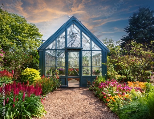 the charming greenhouse nestled in a lush garden full of vibrant plants