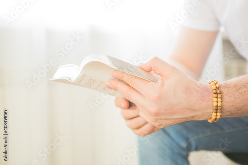 The Christian holds the Bible in his hands. Reading the bible. The concept of faith, spirituality and religion
