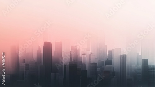 The city skyline fades into pink and orange hues, shrouded in fog, creating a mysterious and beautiful urban scene at dusk
