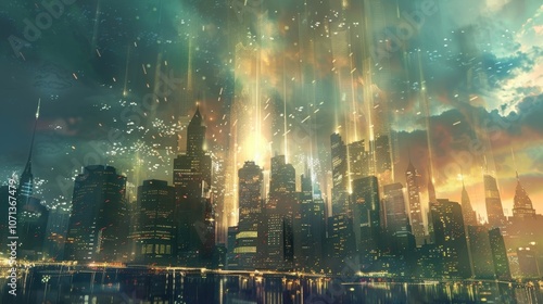 The city skyline was lit up by an array of enchanted light beams giving the buildings a whimsical and ethereal appearance.