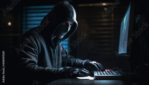 The computer hacker in a hooded shirt is stealing data generated by AI