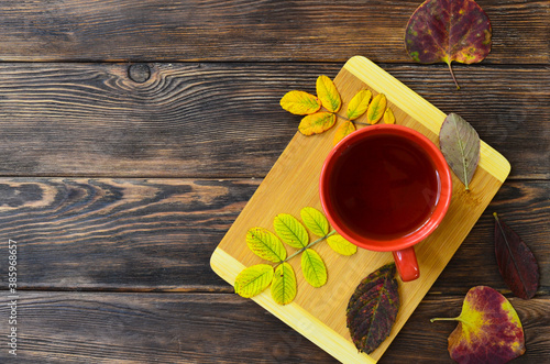 The concept of autumn food. Copy space for text and design. Handmade ceramic plate top view and autumn leaves