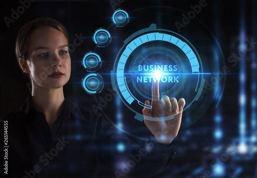 The concept of business, technology, the Internet and the network. A young entrepreneur working on a virtual screen of the future and sees the inscription: Business network