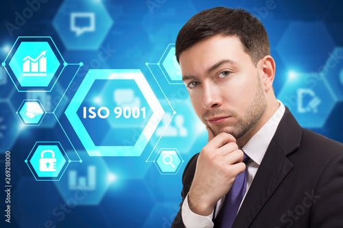 The concept of business, technology, the Internet and the network. A young entrepreneur working on a virtual screen of the future and sees the inscription: ISO 9001