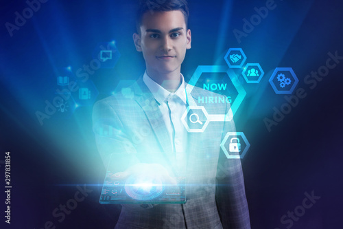 The concept of business, technology, the Internet and the network. A young entrepreneur working on a virtual screen of the future and sees the inscription: Now hiring